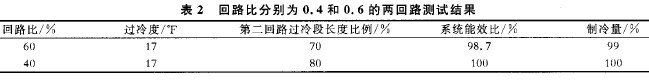 根據(jù)模擬結(jié)果,在一臺機(jī)組上分別測試了回路比為0.6的兩回路與回路比為0.4的兩回路的性能,結(jié)果如表2所示。其中過冷段長度比例通過熱成像拍攝照片估算得出,測試結(jié)果與模擬結(jié)果基本吻合。