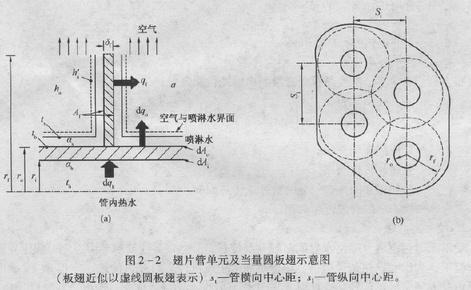 塔內(nèi)管束的管內(nèi)熱水溫度“ 和管外噴淋水溫ts以及管外空氣的焓分布情況如圖2 -1b所示。A.Hasan等人認為;從圖2-1b可以假定,ts可取至實驗測得的噴淋水進口溫度ta1,這是可以接受的。 對板翅管束上述假設(shè)同樣可用, 假定在翅表面和翅間光管段的噴淋水溫均為恒值,今取包含一個翅片在內(nèi)的傳熱管單元體來分析( 圖2—2a) ,研究管內(nèi)熱水對空氣和對噴淋水膜間的熱傳遞。