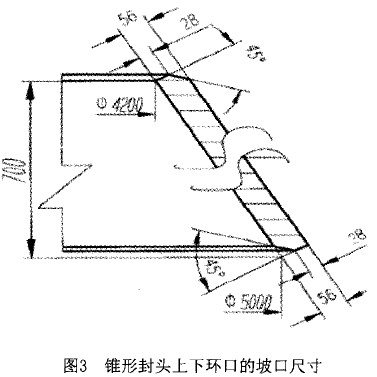 分瓣預(yù)制完成后,將錐形封頭整體成型,瓣片之間采用無(wú)間隙組裝,封頭拼接焊縫對(duì)口錯(cuò)邊量小于等于2mm,拼接焊縫處的棱角應(yīng)小于等于3mm。整體組裝后,各瓣片的上下環(huán)口應(yīng)在同一平面,其偏差值不應(yīng)大于2mm。上、下環(huán)口的圓度不應(yīng)大于10mm,外圓周長(zhǎng)允許偏差為±6mm。錐形封頭高度允許偏差為6mm。